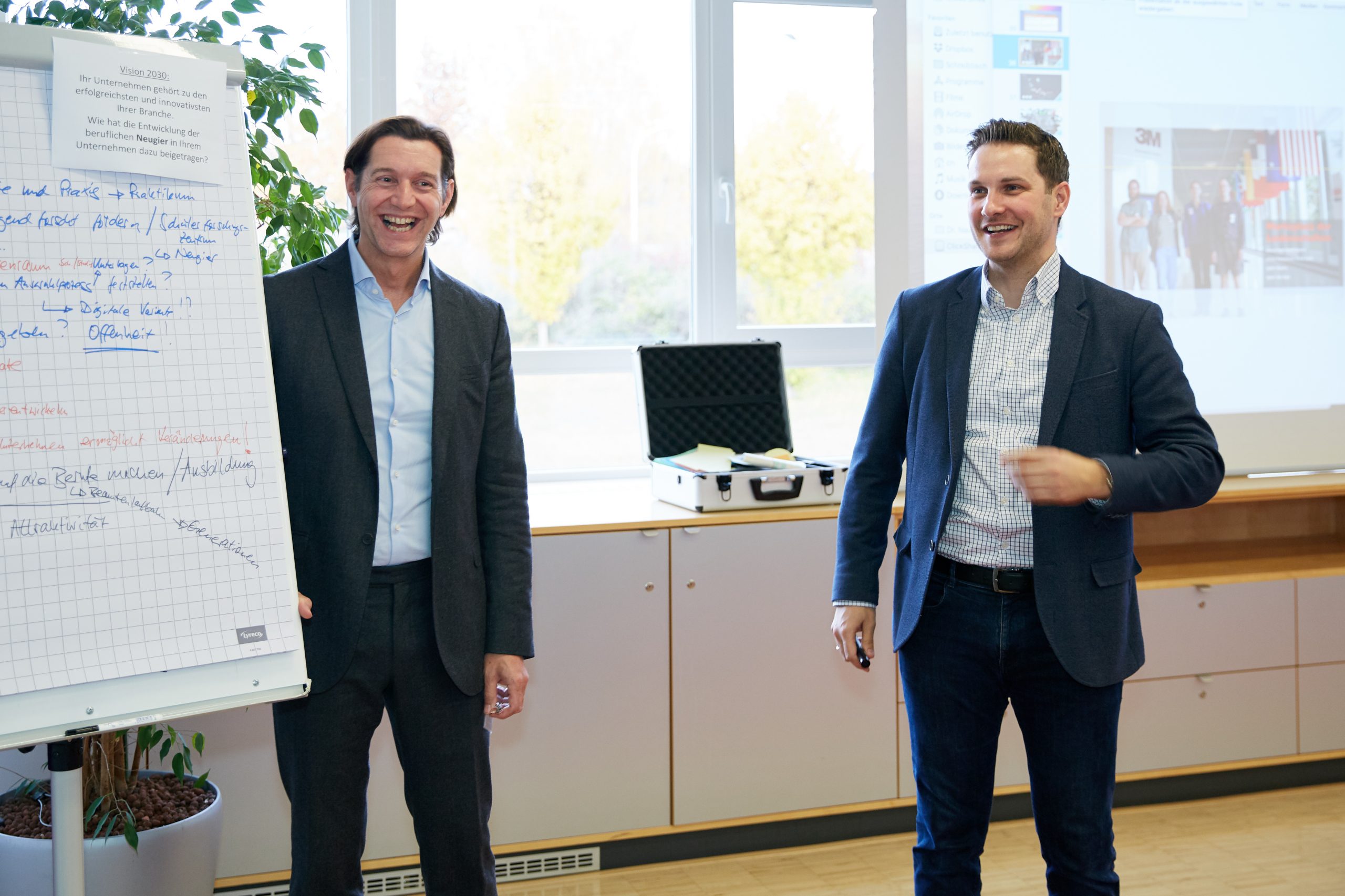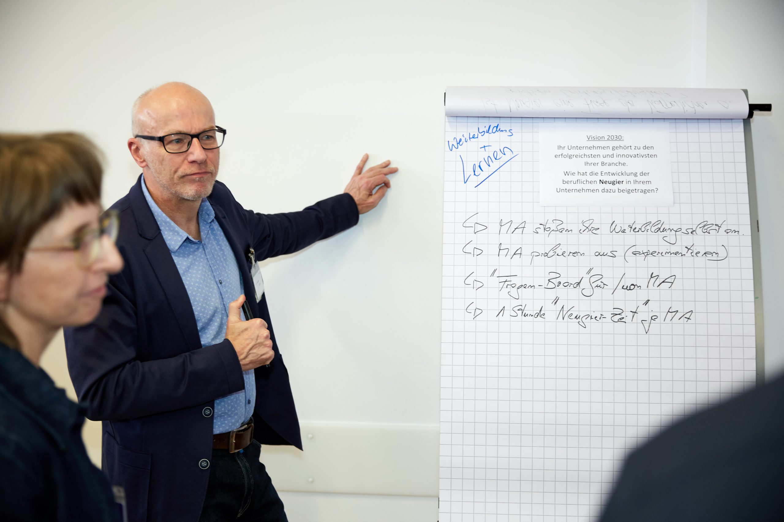 Anschließend stand das nächste Highlight auf der Agenda: Carl Naughton, einer der renommiertesten „Neugier“-Experten, der auch an der Umsetzung der Neugier-Studien bei Merck beteiligt war, teilte mit den TeilnehmerInnen wichtige und interessante Hintergründe, Studienergebnisse und Methoden rund um das Thema. Diese Impulse wurden am Nachmittag im Rahmen eines World Cafés weiter diskutiert. Unsere Arbeitshypothese bildete eine „Vision 2030“: „Ihr Unternehmen gehört zu den erfolgreichsten und innovativsten Ihrer Branche. Wie hat die Entwicklung der beruflichen Neugier in Ihrem Unternehmen dazu beigetragen?“